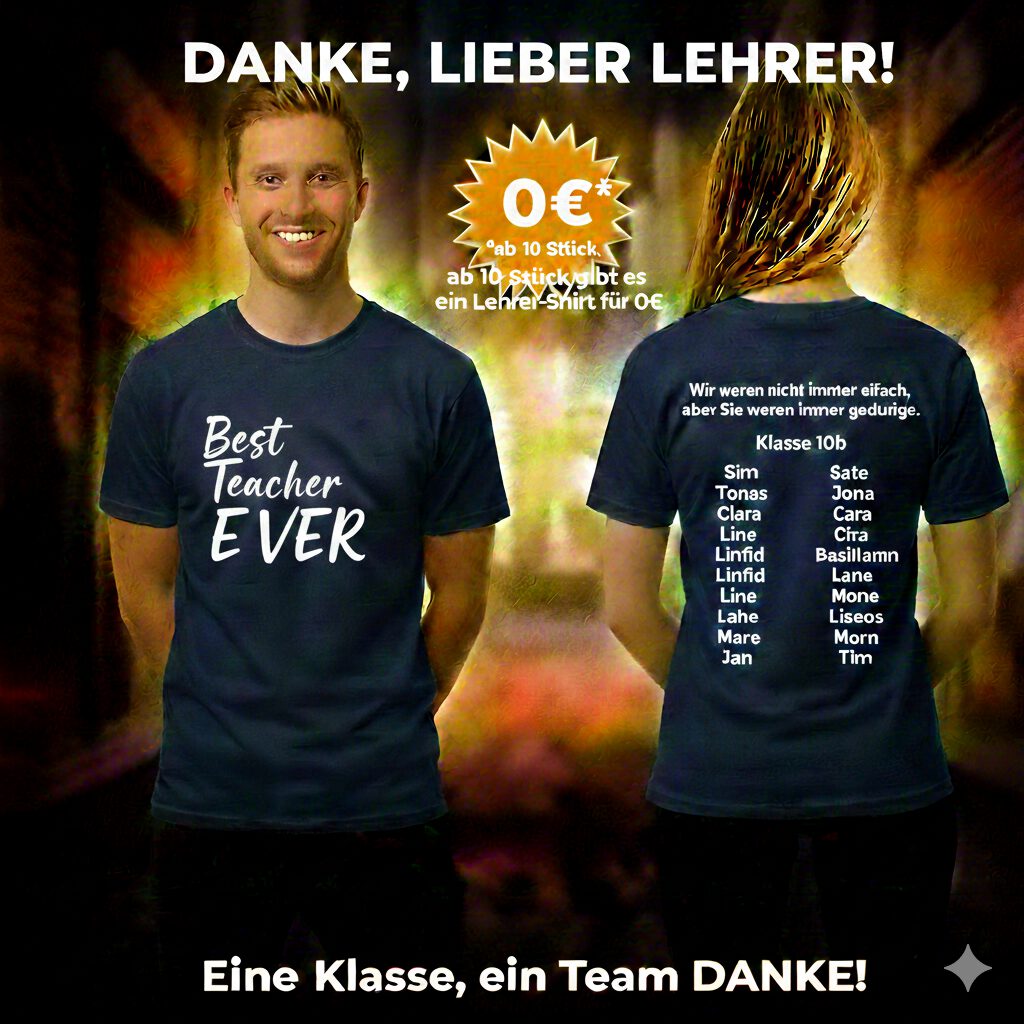Sichert euch passend zu eurem Klassensatz das personalisierte Lehrer-Shirt, das nicht nur durch Qualität, sondern durch echte Wertschätzung überzeugt.