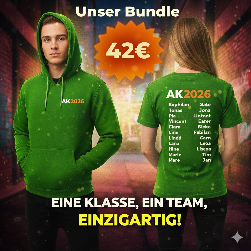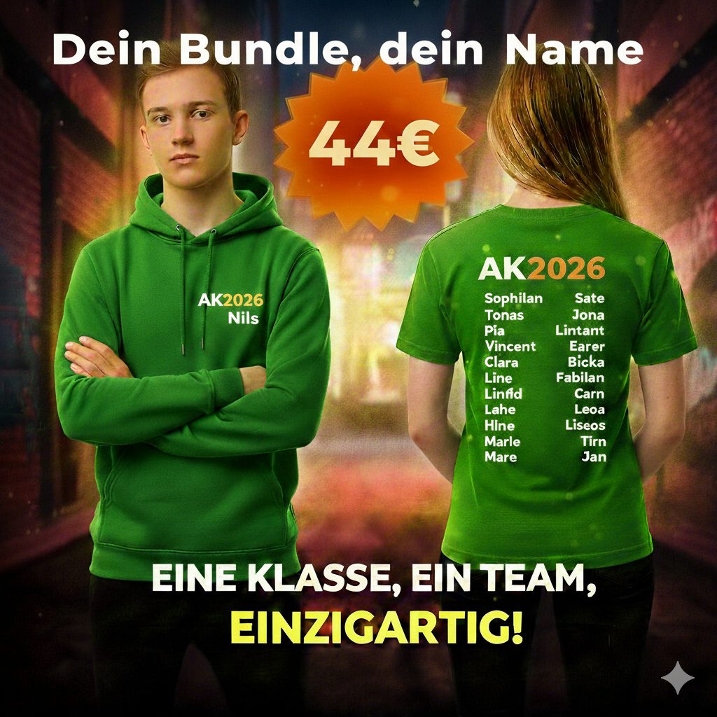 Das Personal-Bundle: Shirt & Hoodie mit eurem Namen zum Bestpreis! Maximale Individualität trifft Top-Qualität – sichert euch das personalisierte Abschluss-Set für euren Jahrgang.