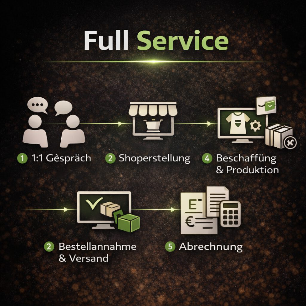 Dein Kopf bleibt frei für deine Musik, deinen Sport oder dein Business. Wir sorgen dafür, dass dein Merch läuft.